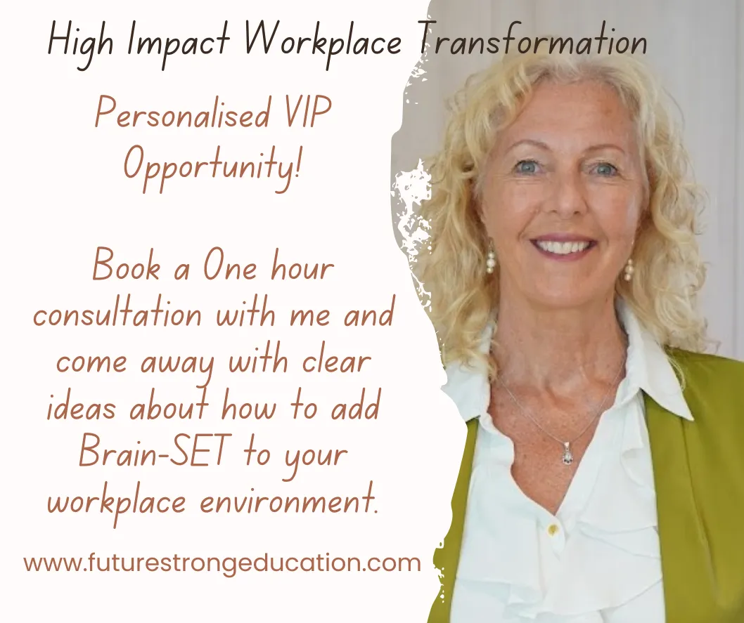 Dr Kathryn Murray is an inspirational changemaker, passionate about creating opportunities to give people the best possible workplace life. She is proud to be the founder of Future Strong Education Consultancy, based in Australia. Her revolutionary and original Brain-SET Environments Formula® is positively impacting workplaces around the world by changing spaces to support the needs of the brain. Kathryn's process minimises stress triggers and adds to wellbeing, workplace, creativity, enthusiasm, engagement and productivity. Her 40+ years in the education sector have given her a wide range of skills to effect workplace mindset and culture change for absolutely amazing outcomes. She provides mindset staff training, conferences, workshops and Keynote presentations. Brain-SET has transformed lives globally and Kathryn is grateful to have had the opportunity to support children, educators, teams, executives, leaders and parents to be all they can be – one environment at a time.